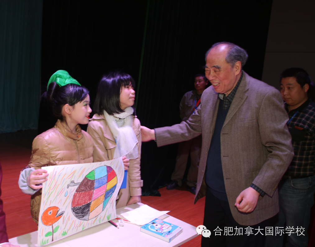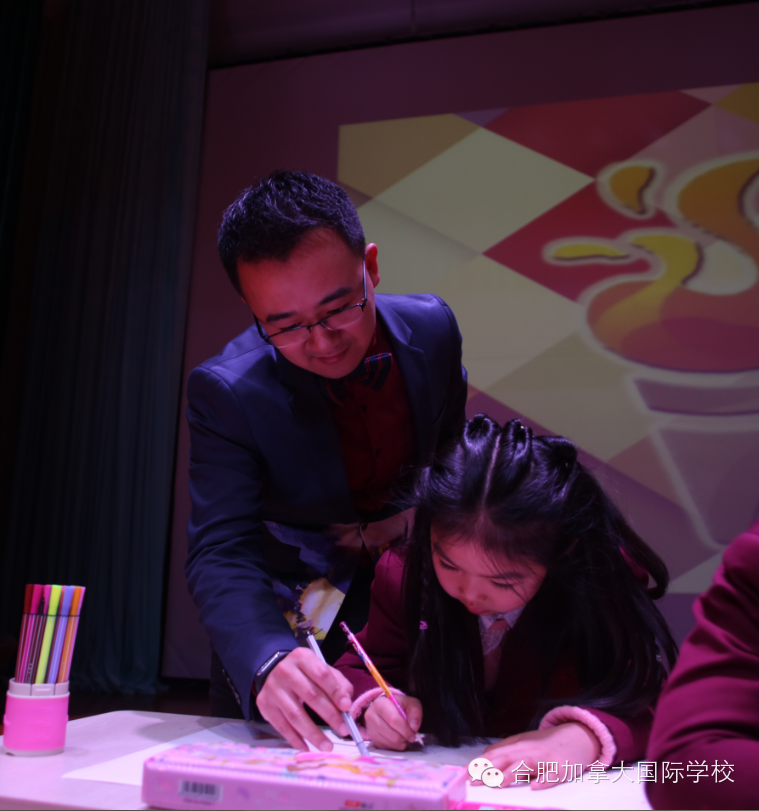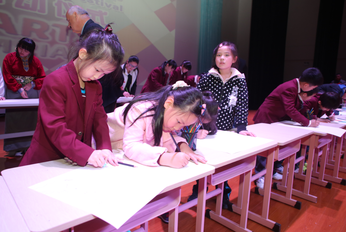 在众多精彩致辞结束后,中国书法家协会、著名书法家卜希旸老师关于书法教育和孩子艺术灵感的启发做了书法艺术讲座。精彩的讲座后,进行的是本次启动仪式最精彩环节“当小艺术家碰上大艺术家”,在老师的带领下,30名来自合肥加拿大国际学校和合肥高新中加的学生代表们和来自35中的藏族学生代表上台现场作画并接受艺术家的评鉴指导,短短二十分钟,凭借团队合作的力量,孩子们作出了心中最美的画卷。卜希旸老师、杨国新老师上台对孩子作品进行点评。“如此短的时间里,这么小的孩子能表现得这么精彩,着实不易。”两位老师一致认为,艺术教育给孩子们熏陶将会影响其一生,包括创造力、发散思维等,都将会有质的飞跃。